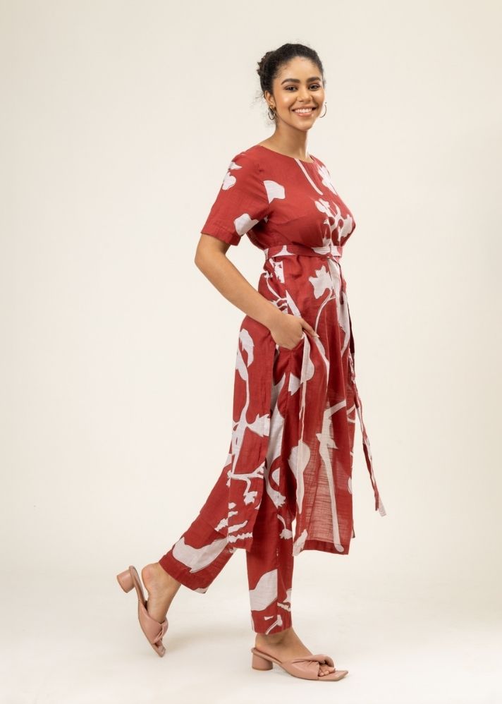 "فستان بفتحات على الجانب وحزام على الخصر. الجيب: جيوب داخلية. صنع في الهند: هذا المنتج مصنوع في دلهي من خلال مصنع بأجور عادلة. المصنع متخصص في الإنتاج على نطاق صغير، حيث يمكننا تقليل توليد النفايات وإدارة نفايات المصنع عن طريق إعادة تدوير الخردة إلى نسيج مرقع. قد تأتي كل قطعة مع تطريز أو رقعة إضافية ولكن الشكل والمظهر العام للقطعة لا يتغير. هذه القطع هي جزء من مجموعة ذات إصدار محدود، ويتم تصنيع المخزون حتى تتوفر المواد الخام."
