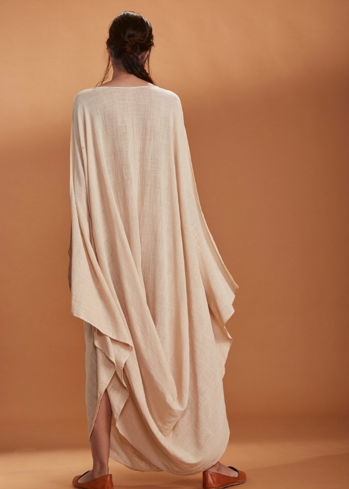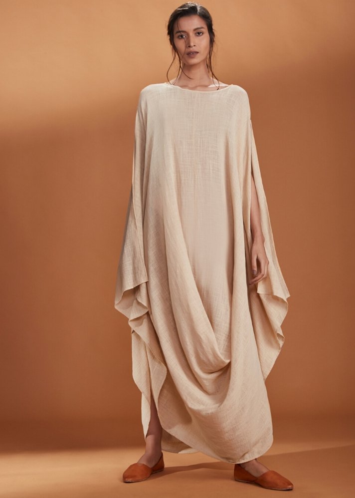 فستان طويل جميل على شكل قلنسوة بأكمام طويلة وقصة سهلة مع بطانة تكمل المظهر.