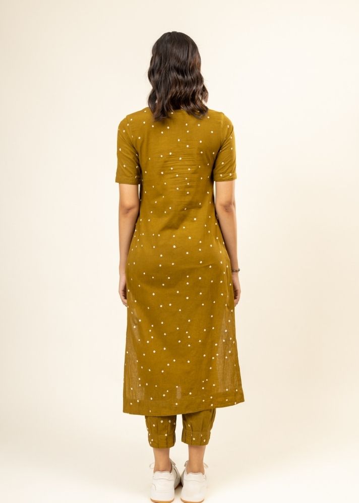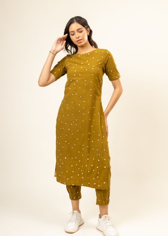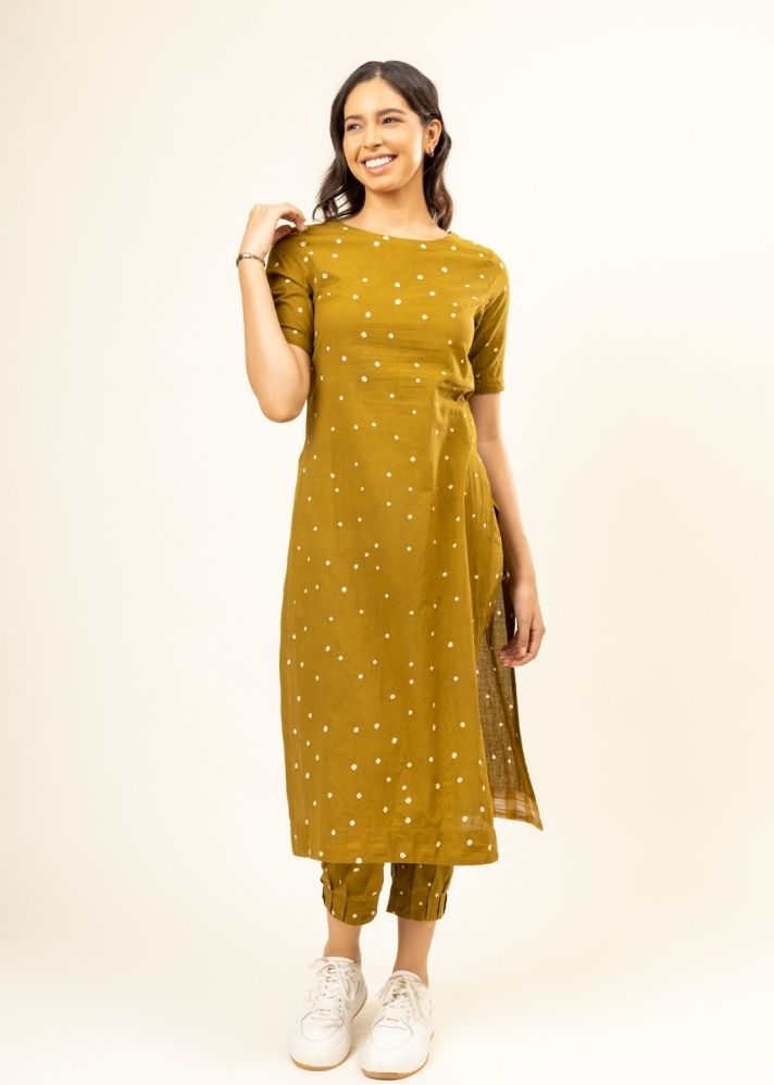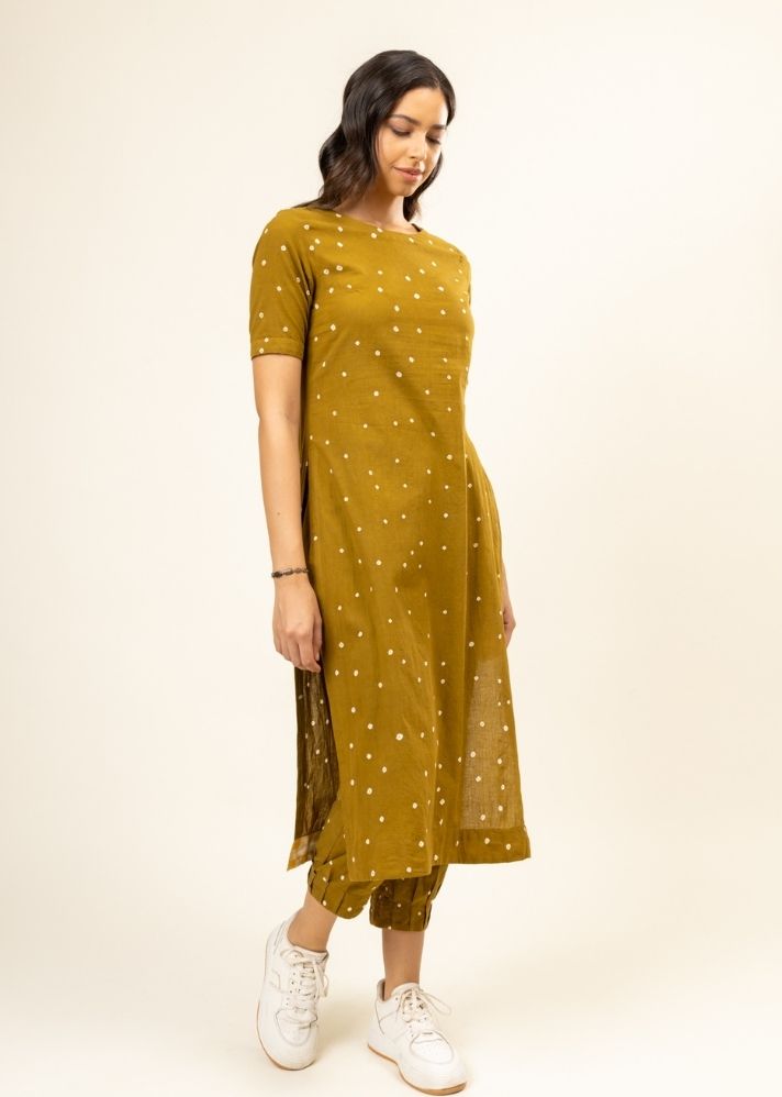 "تونك Bandhani بفتحات جانبية . بنطال مريح معاد تدويره بحاشية مدسوسة وظهر مطاطي. الفتحة: بنطال بسحاب جانبي للإغلاق. صنع في الهند: تم تصنيع هذا المنتج في دلهي من خلال مصنع للأجور العادلة وتمت طباعته باستخدام مجموعة حرفية في بهوج. المصنع متخصص في الإنتاج على نطاق صغير، حيث يمكننا تقليل توليد النفايات وإدارة نفايات المصنع عن طريق إعادة تدوير الخردة إلى نسيج مرقع. قد تأتي كل قطعة مع تطريز أو رقعة إضافية ولكن الشكل والمظهر العام للقطعة لا يتغير. هذه القطع هي جزء من مجموعة ذات إصدار محدود، ويتم تصنيع المخزون حتى تتوفر المواد الخام."